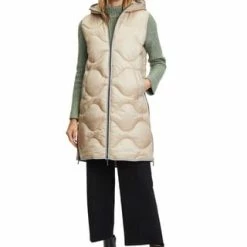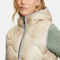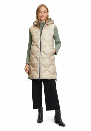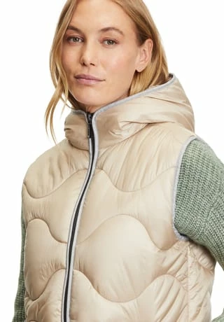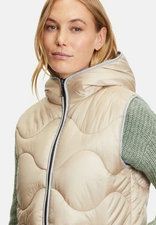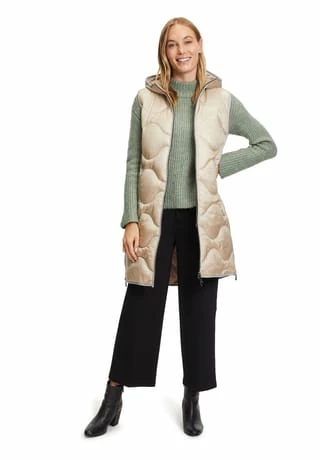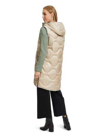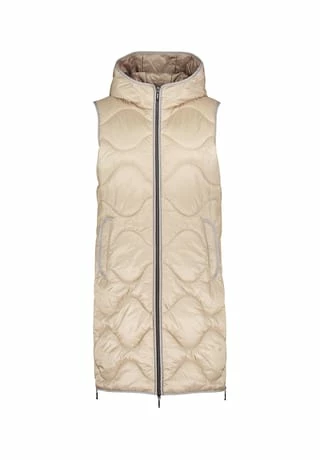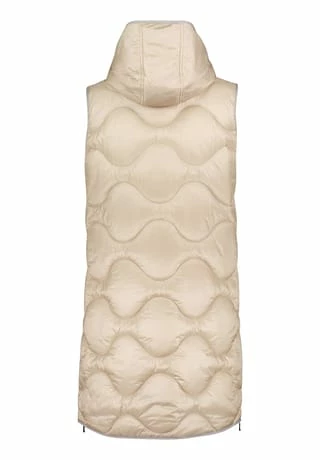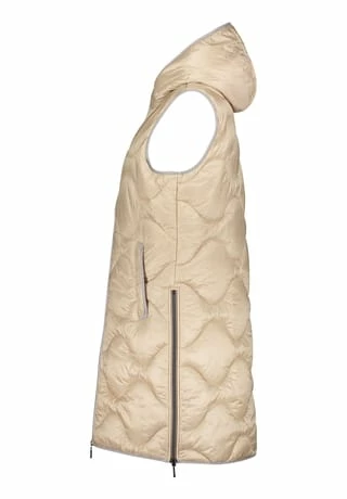 Das könnte Ihr neues Lieblingsteil werden! Modische Sandwich versteppte Longweste der Marke Gil Bret mit einer innovativen Ocean recycled Watte gefüllt, in einer schönen Polyamidware mit Kapuze und und praktischem Zweiwege Reißverschluss vorne. Die Innenseite der Weste ist in Kontrast gehalten.