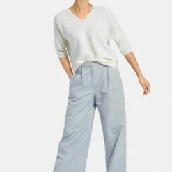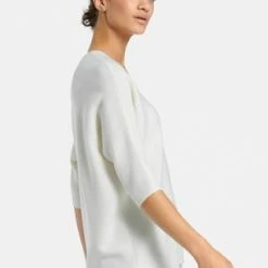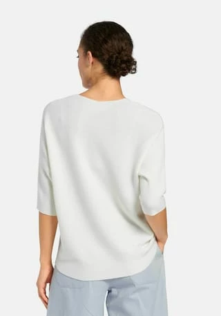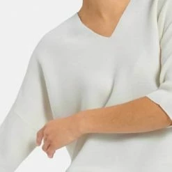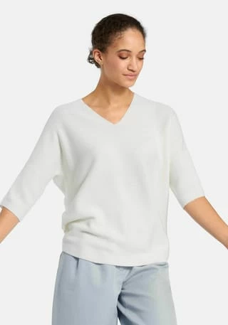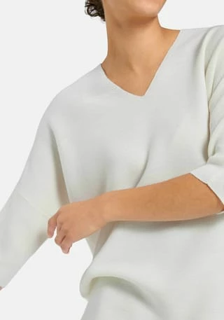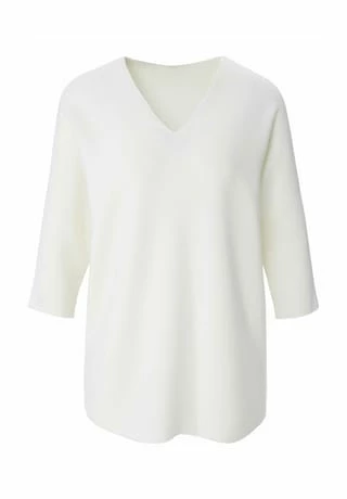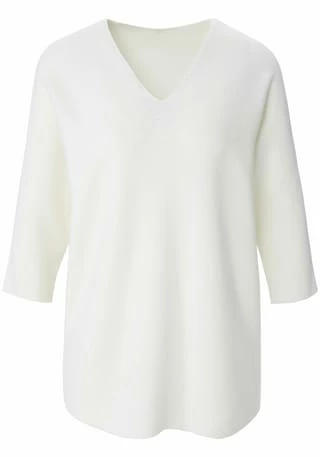V-Pullover von PETER HAHN mit 3/4-Arm. Lässiger Oversized-Style mit überschnittener Schulter, gerundetem Saum in Links-links-Strick und einem kleinen V-Ausschnitt im Rückteil. Länge ca. 60 cm. 100% Schurwolle. Dieser V-Pullover ist maschinenwaschbar.
