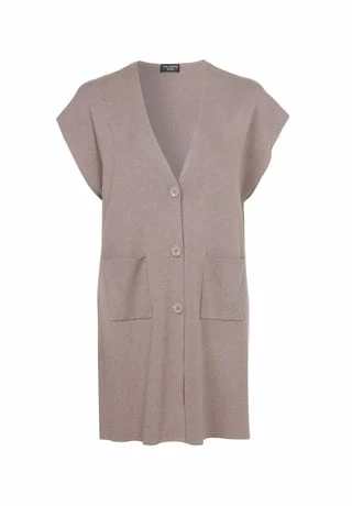 Kommen Sie gut gestylt durch die kalte Jahreszeit – mit dieser oberschenkellangen Shirtweste von VIA APPIA DUE. Für die klassische Optik sorgt das unifarbene Design. Die überschnittenen Schultern und die Knopfleiste sorgen dabei gleichzeitig für eine moderne Optik und der V-Ausschnitt setzt einen femininen Akzent.